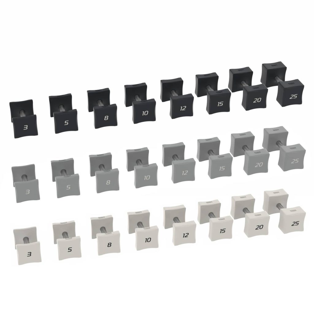A new shape in training. Dumbbells designed to inspire form and function. Premium urethane heads with a choice of modern color pallet for Studio, Hotel, or Home. Dumbbells are sold in sets of 3-25lbs (8 pairs) or 5-50lbs (10 pairs) offering a complete range for every strength training requirement. Designed for all your favorite dumbbell workouts, the quality and safety of our urethane dumbbell weights offer a complete foundation for all types of at home home or in the gym workouts.